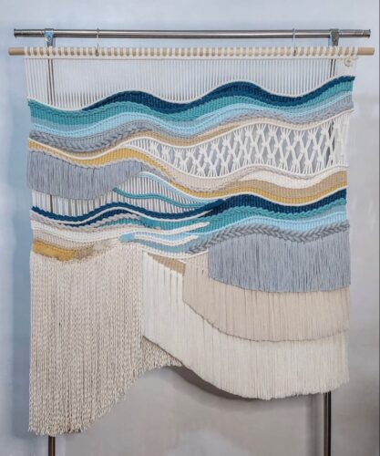 A bold, dark-toned abstract piece with dynamic movement and sharp transitions. The viscose elements add a sleek sheen, elevating the rich New Zealand wool base.